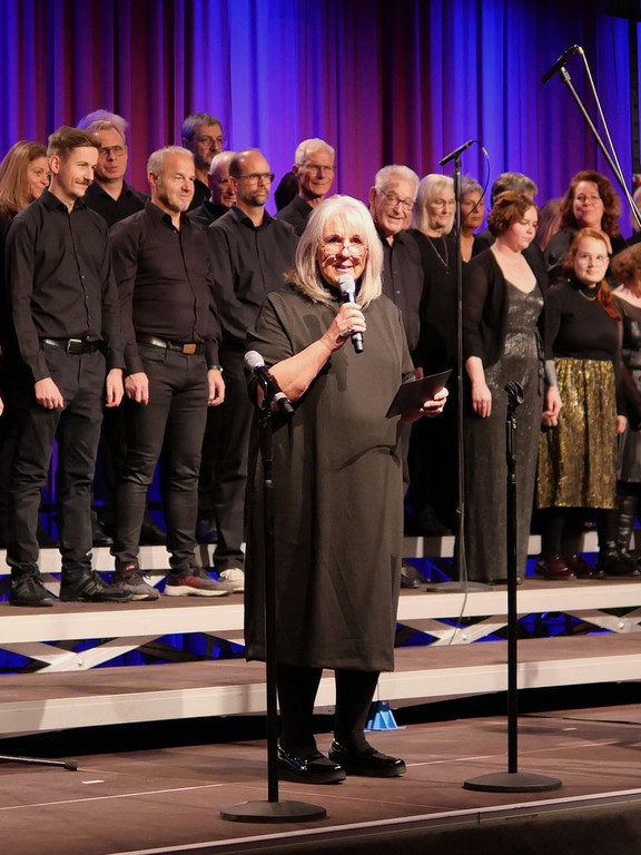 Janina Moeller, Chorleiterin von Happy Voices überzeugte durch ihr temperamentvolles Dirigat. Ihre lebhafte, zugewandte Art ließ die Sängerinnen und Sänger strahlen und gut gelaunt und vor allem textsicher ihre Songs vortragen.